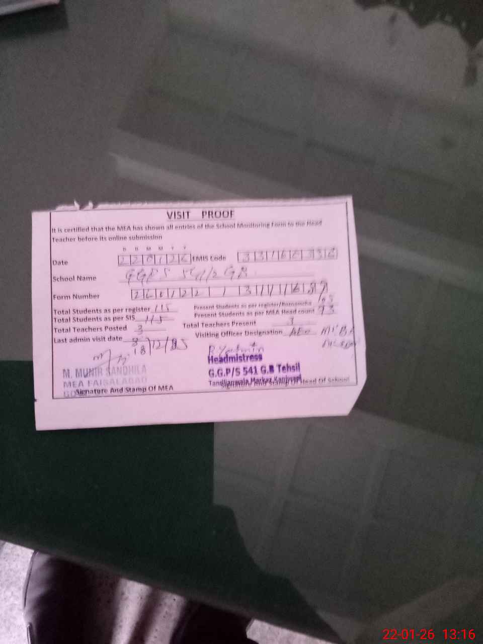 | Attendance Register | Head Teacher | MEA with School | Visit Proof |