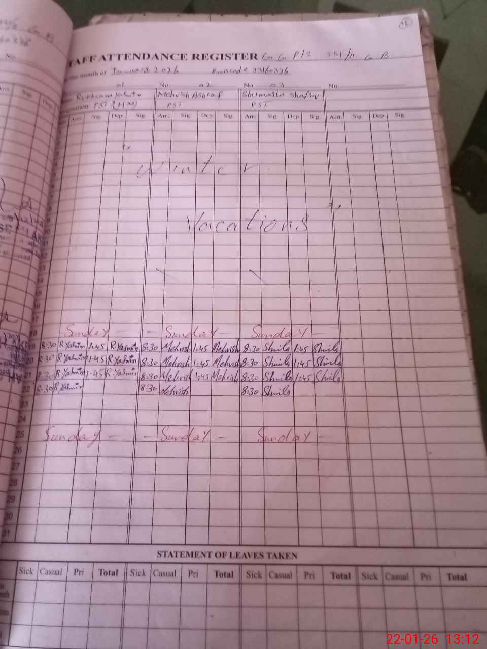 | CNIC | Full Name | Designation | R/C | Absence During Last Calender Month |
