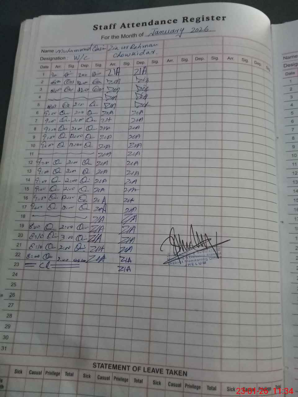 | Remarks (Use Separate Page if Required): HT Shahid Saghir SST is on CL on duty No admin visit for last month | |||||