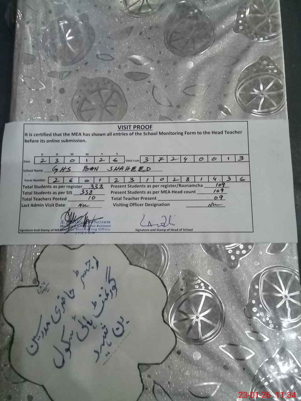 | Attendance Register | Head Teacher | MEA with School | Visit Proof |