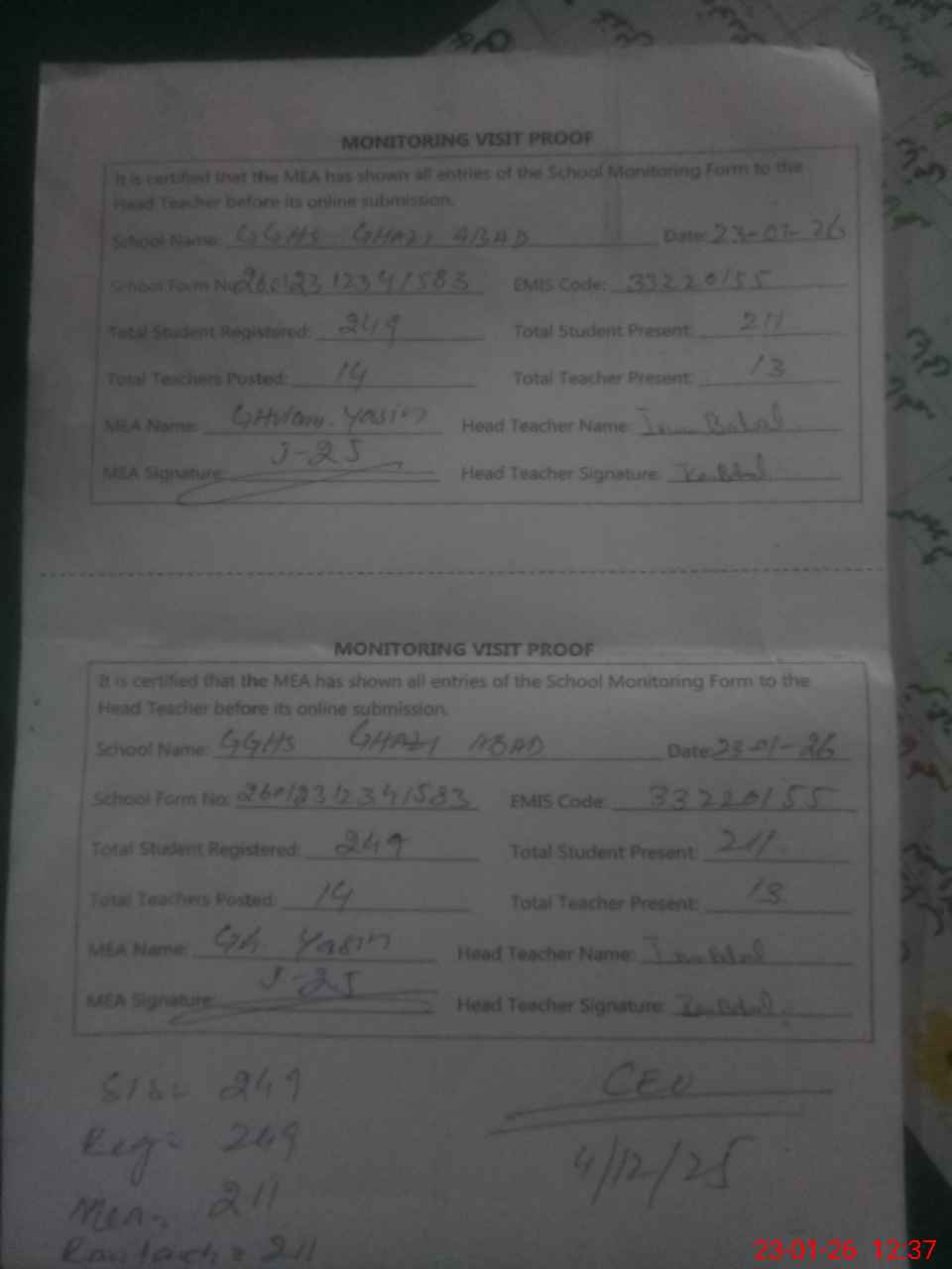 | Attendance Register | Head Teacher | MEA with School | Visit Proof |