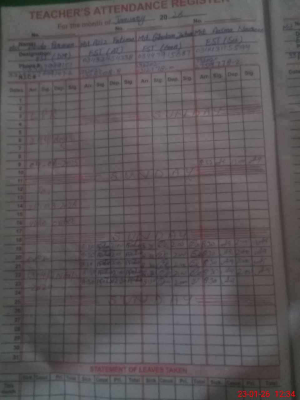 | CNIC | Full Name | Designation | R/C | Absence During Last Calender Month |
