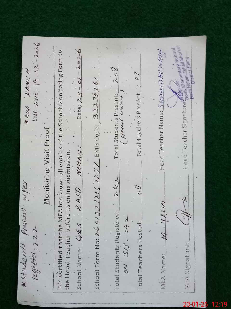 | EMIS Code: 33230261 | Name of School: GES BASTI NOHANI | |||
