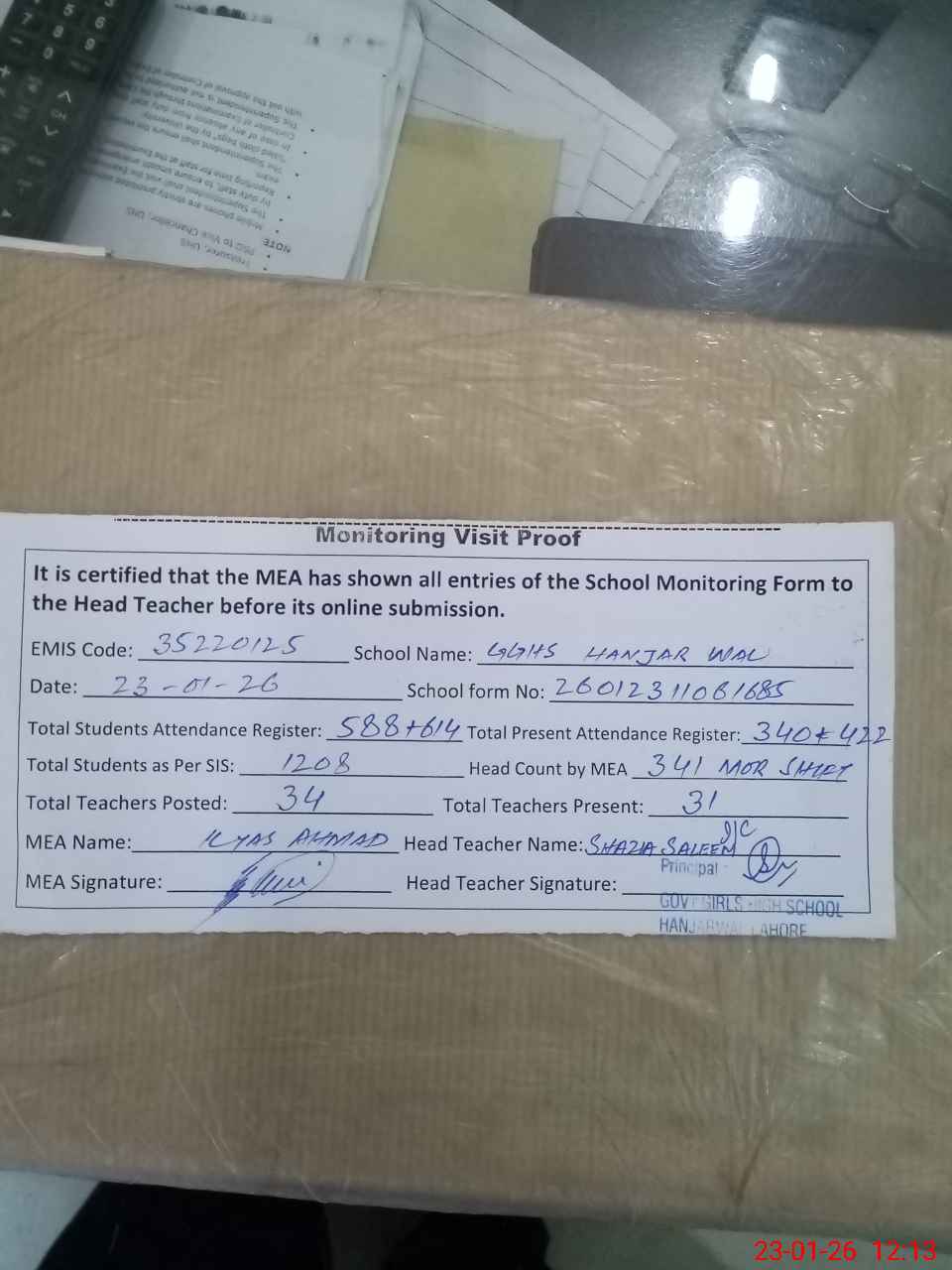 | Attendance Register | Head Teacher | MEA with School | Visit Proof |