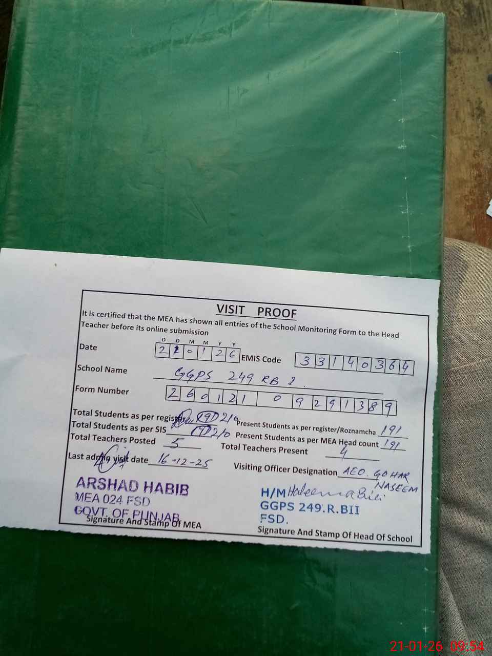| Attendance Register | Head Teacher | MEA with School | Visit Proof |