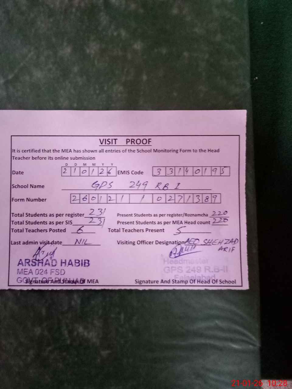 | Certified that this School was Inspected by the Undersigned MEA/DMO Today and the Information Stated Above is as Per Record. | |||||