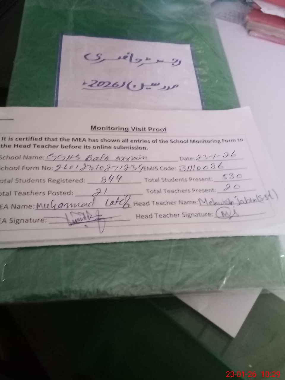 | Attendance Register | Head Teacher | MEA with School | Visit Proof |