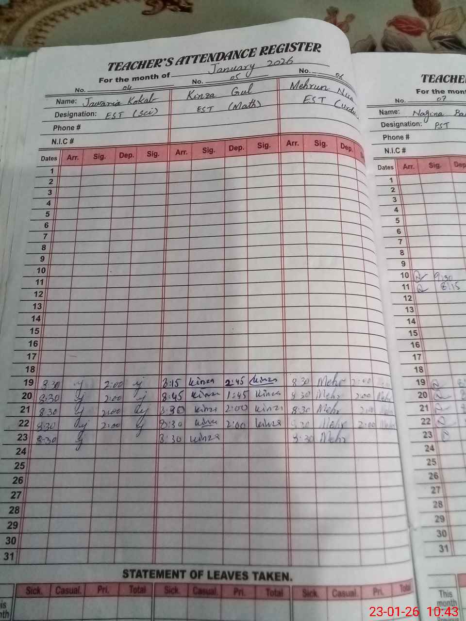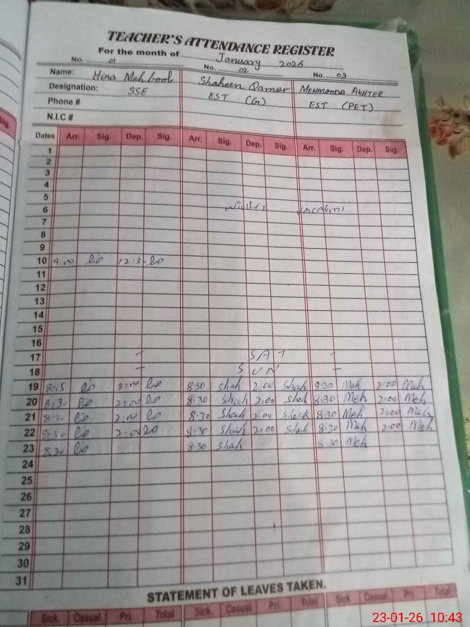 | CNIC | Full Name | Designation | R/C | Absence During Last Calender Month |