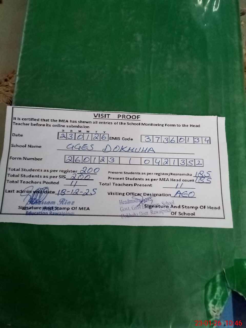 | Attendance Register | Head Teacher | MEA with School | Visit Proof |