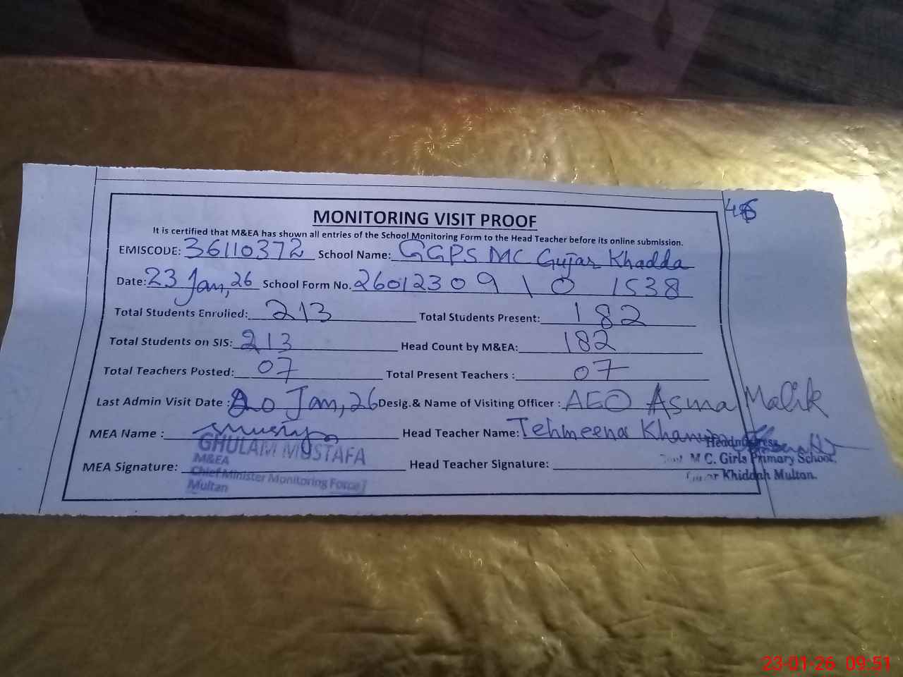 | EMIS Code: 36110372 | Name of School: GGPS MC GUJAR KHADDA MULTAN | |||