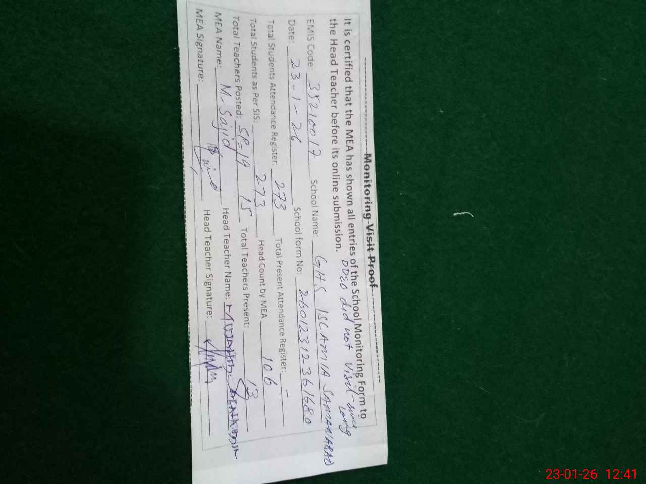 | Attendance Register | Head Teacher | MEA with School | Visit Proof |