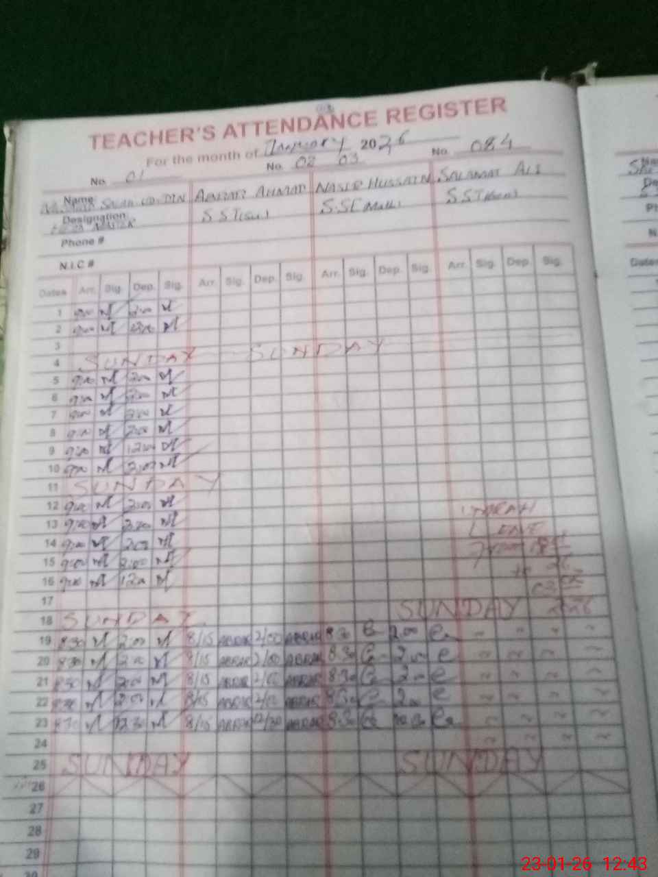 | 35**** | Sa**** Za**** | SST Computer Science | Regular | 0 | 0 | 31 | 0 | 0 | 0 | 0 | 0 | 0 | Absent (Un-Authorized) |