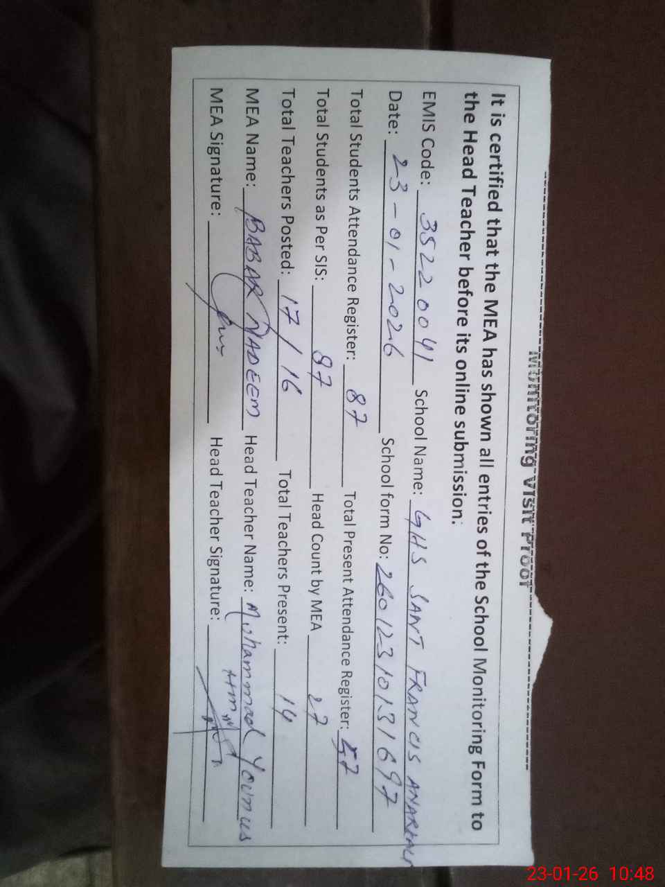 | Attendance Register | Head Teacher | MEA with School | Visit Proof |