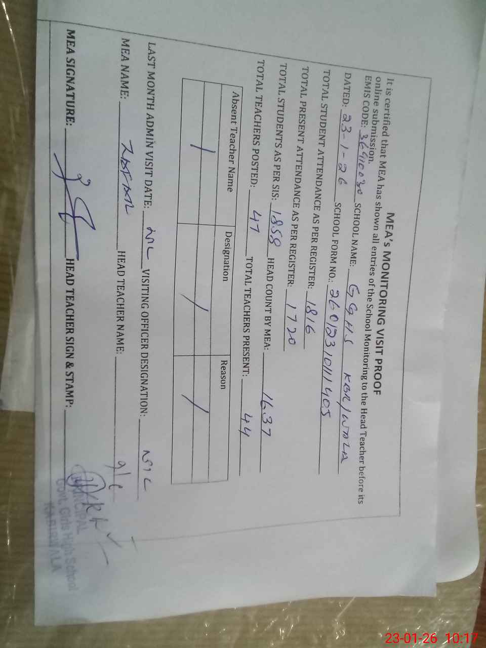 | EMIS Code: 36410030 | Name of School: GGHS KABIRWALA, KUTCHERY BAZAR, KABIRWALA | |||
