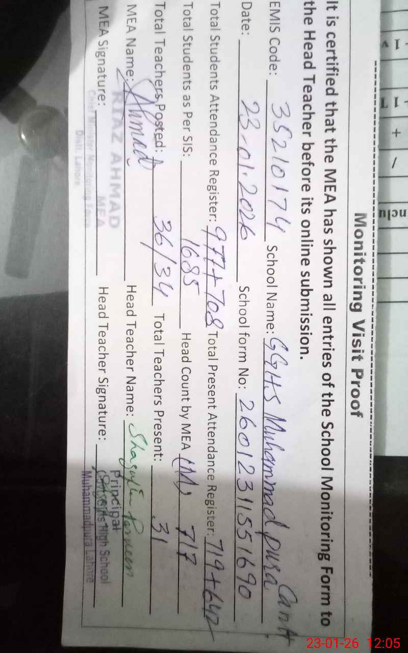 | EMIS Code: 35210174 | Name of School: GGHS MUHAMMAD PURA GHAZI ROAD | |||