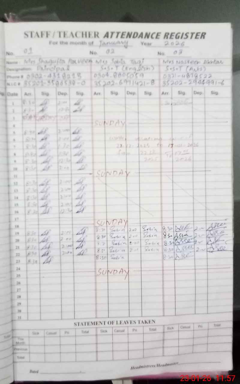 | Remarks (Use Separate Page if Required): Shazia Prrvain pst is absent since 01 September 2024 PA, DS (G) visited this school on 09/12/25 | |||||
