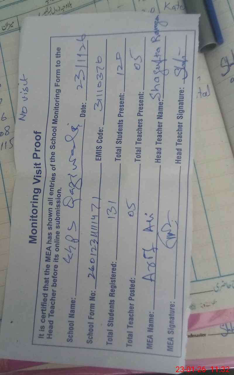 | Attendance Register | Head Teacher | MEA with School | Visit Proof |