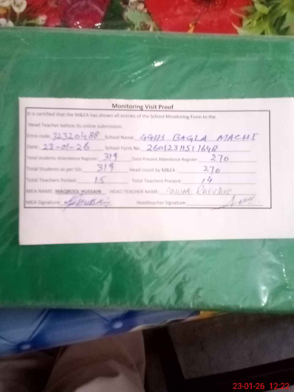 | Attendance Register | Head Teacher | MEA with School | Visit Proof |