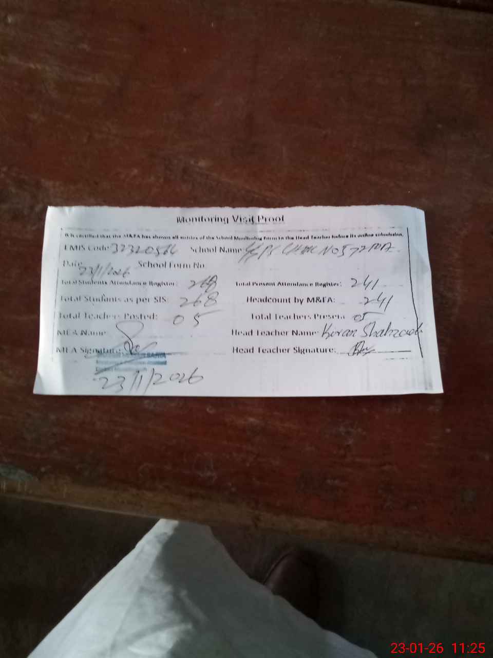 | Attendance Register | Head Teacher | MEA with School | Visit Proof |