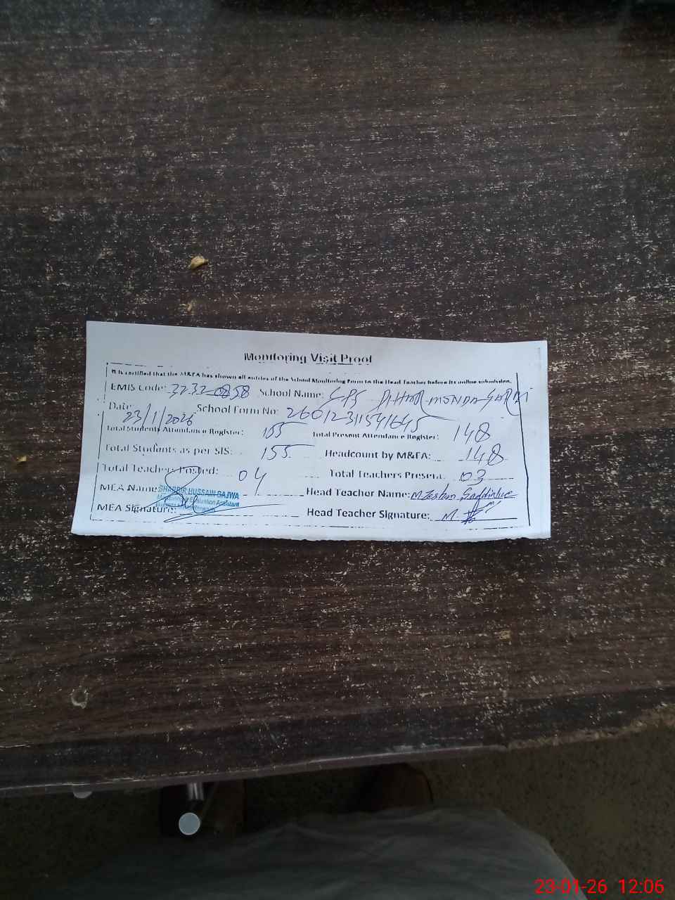 | Attendance Register | Head Teacher | MEA with School | Visit Proof |