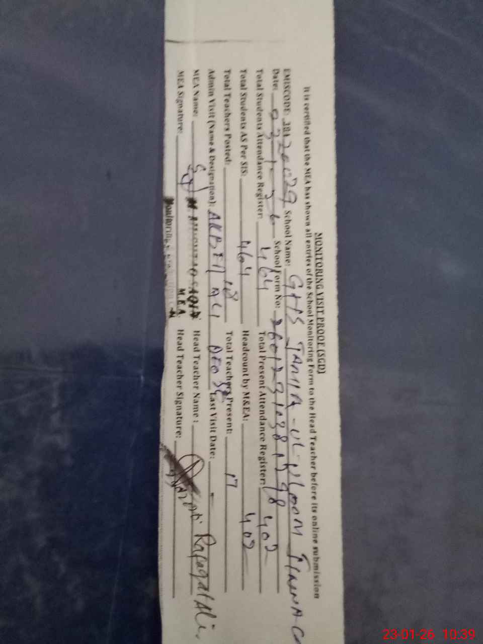 | Attendance Register | Head Teacher | MEA with School | Visit Proof |