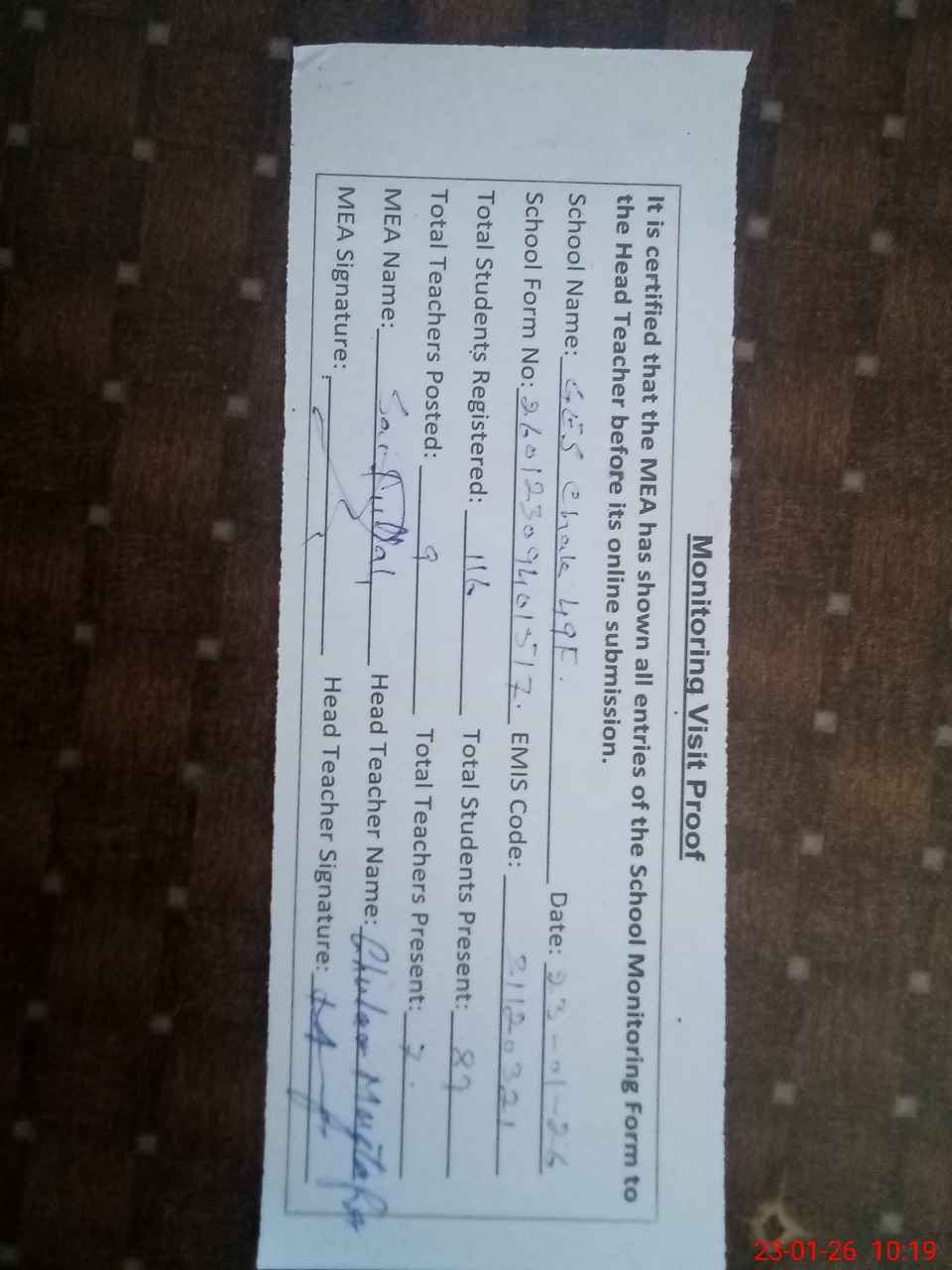 | Attendance Register | Head Teacher | MEA with School | Visit Proof |