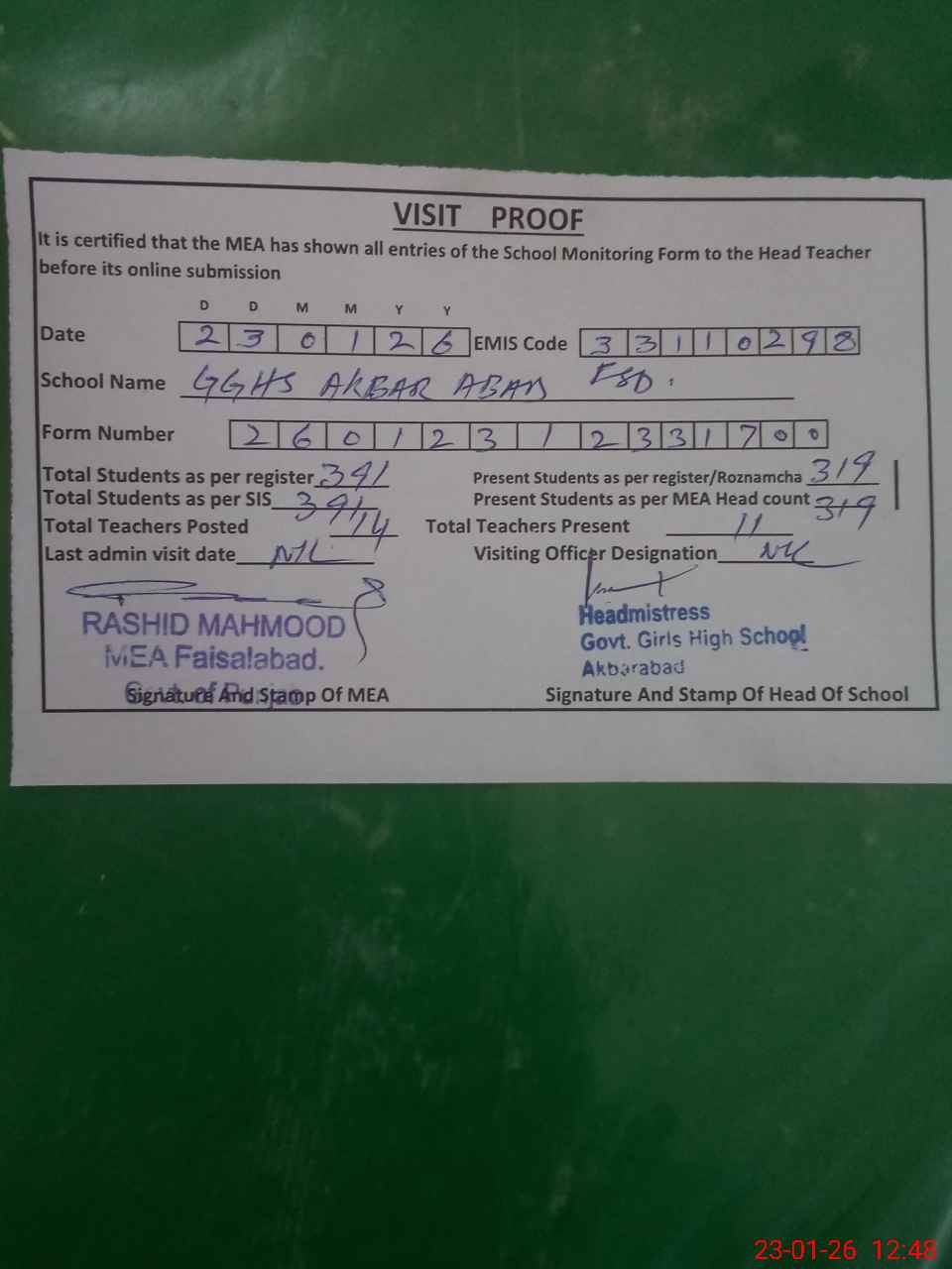 | Attendance Register | Head Teacher | MEA with School | Visit Proof |