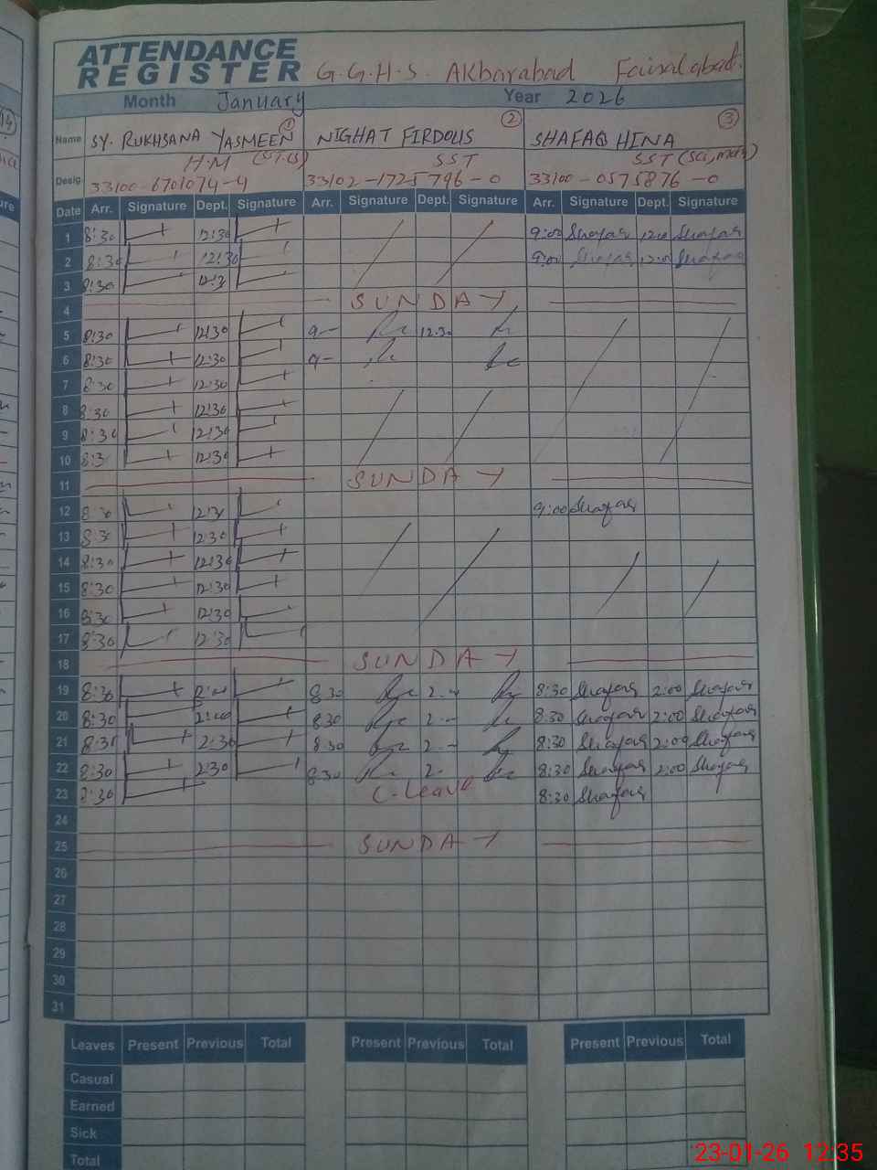 | CNIC | Full Name | Designation | R/C | Absence During Last Calender Month |