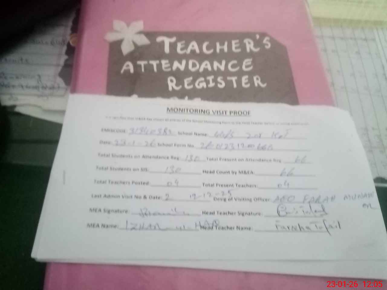 | Attendance Register | Head Teacher | MEA with School | Visit Proof |