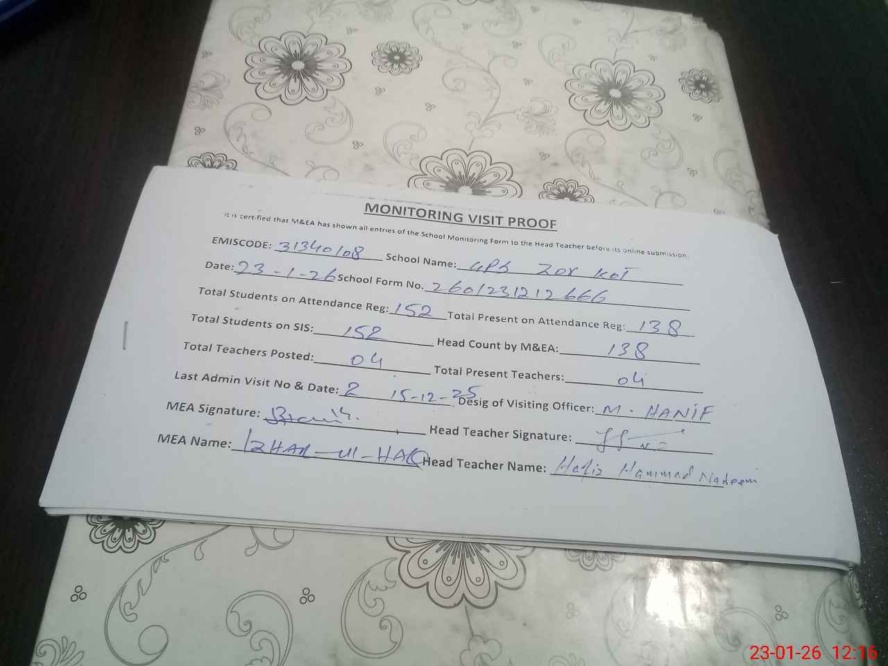| EMIS Code: 31340108 | Name of School: GPS ZOOR KOT | |||