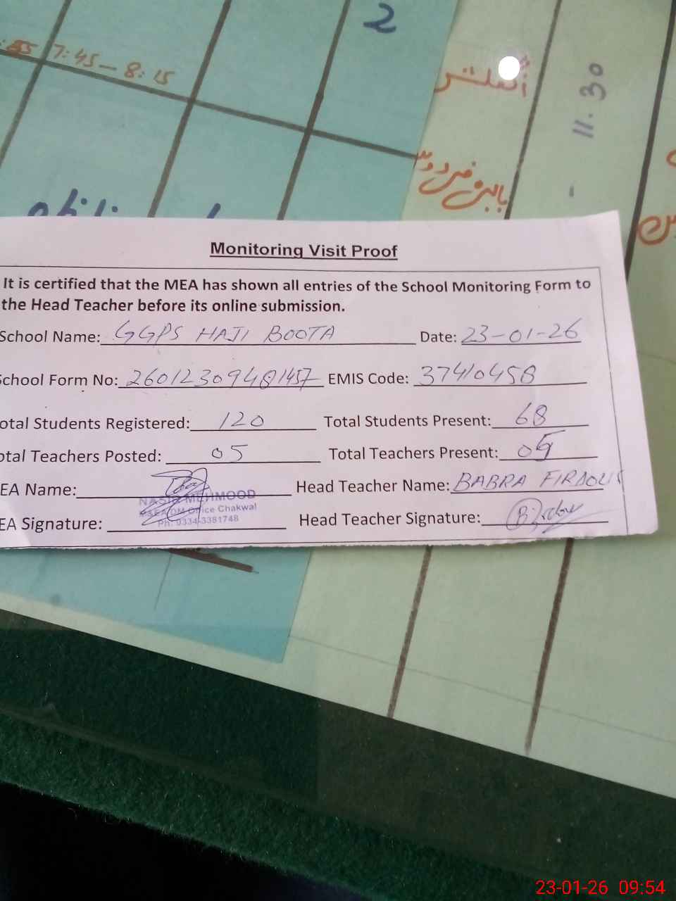 | Attendance Register | Head Teacher | MEA with School | Visit Proof |