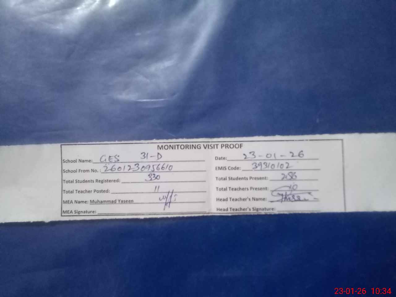 | Attendance Register | Head Teacher | MEA with School | Visit Proof |