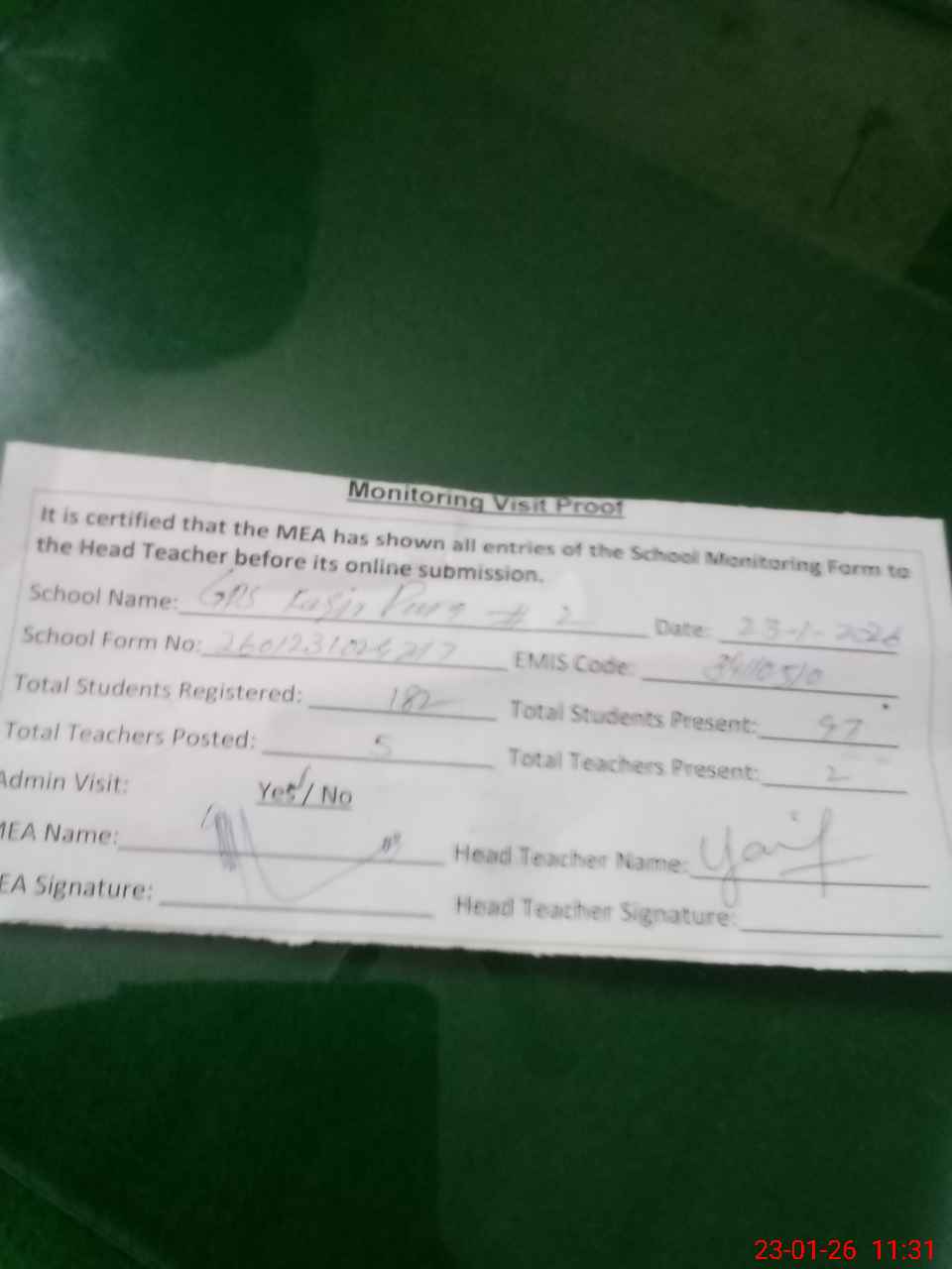 | Attendance Register | Head Teacher | MEA with School | Visit Proof |