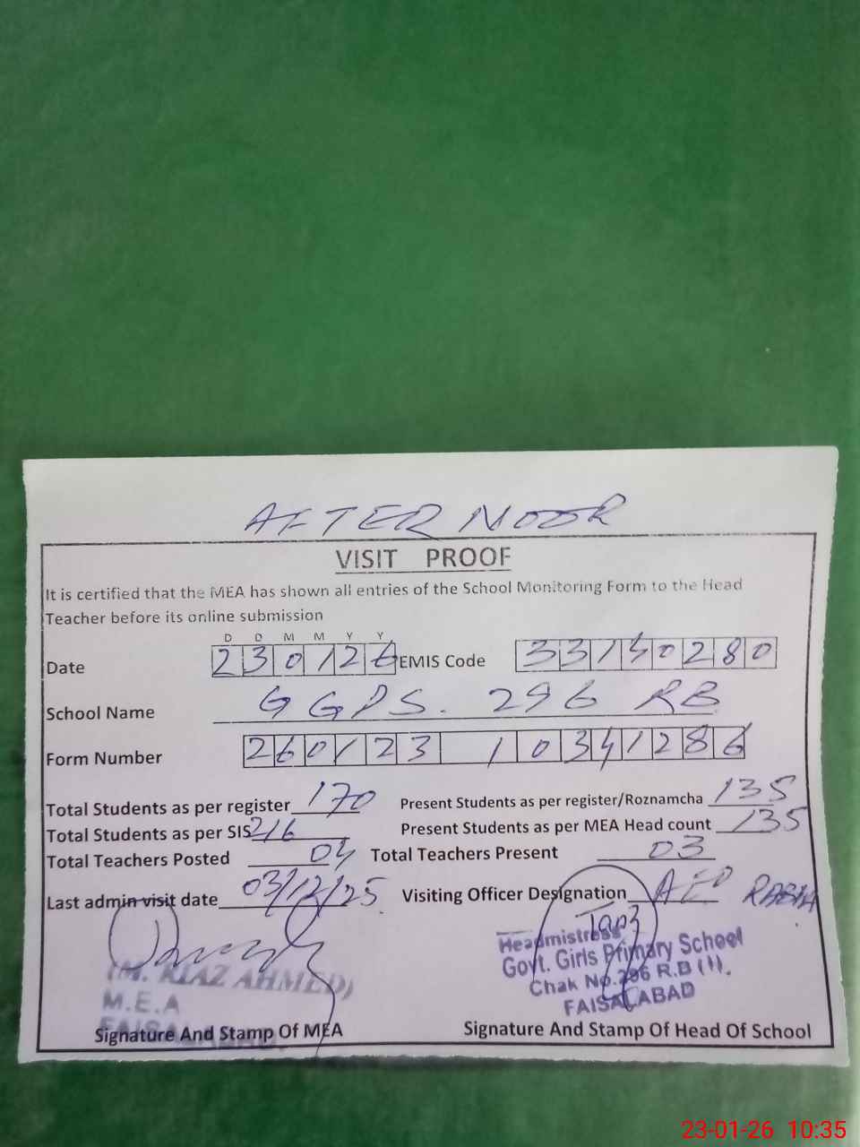| EMIS Code: 33140280 | Name of School: GGPS CHAK 296 RB WAKEEL WALA | |||
