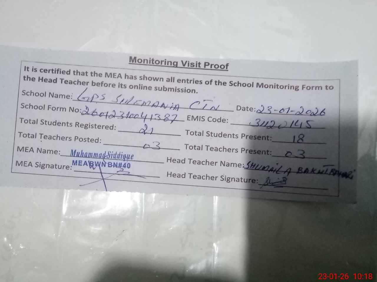 | Attendance Register | Head Teacher | MEA with School | Visit Proof |