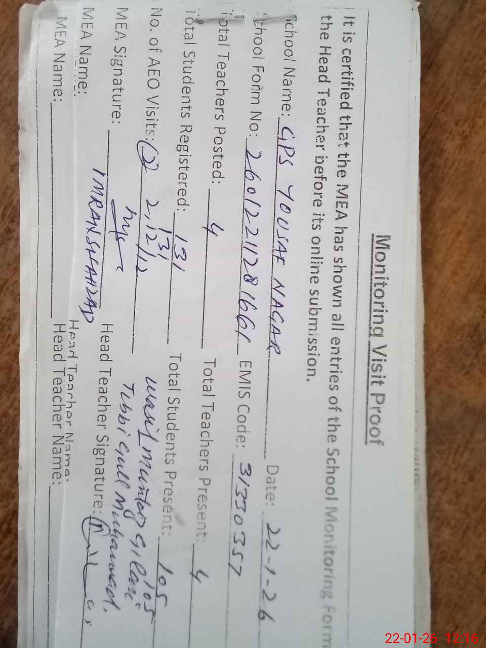 | EMIS Code: 31330357 | Name of School: GPS YOUSAF NAGAR | |||