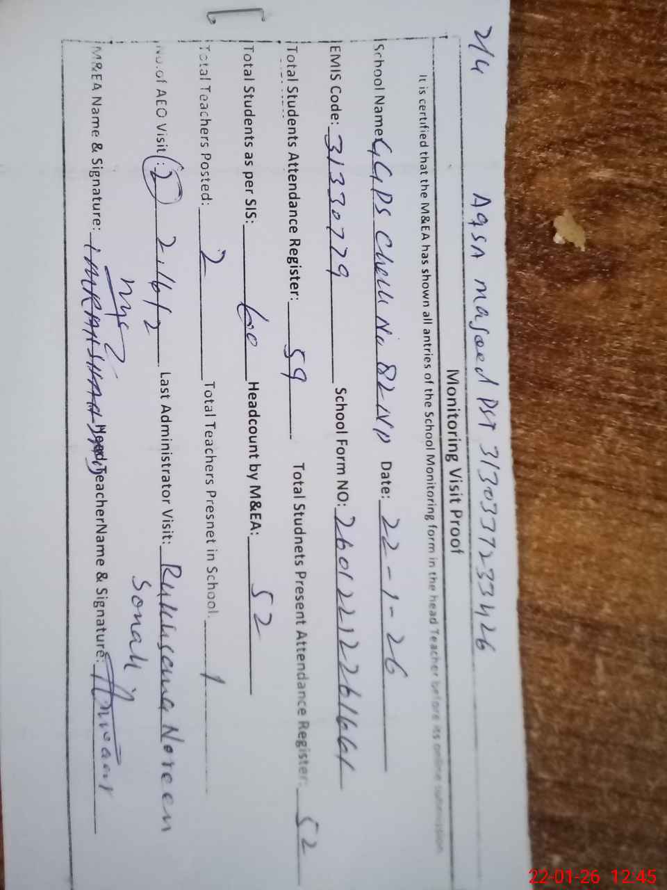 | Name: Aq**** Ma**** Designation: (School Headmaster's/Headmistress's) PST/PTC/JV Phone/Cell Number: 03**** |