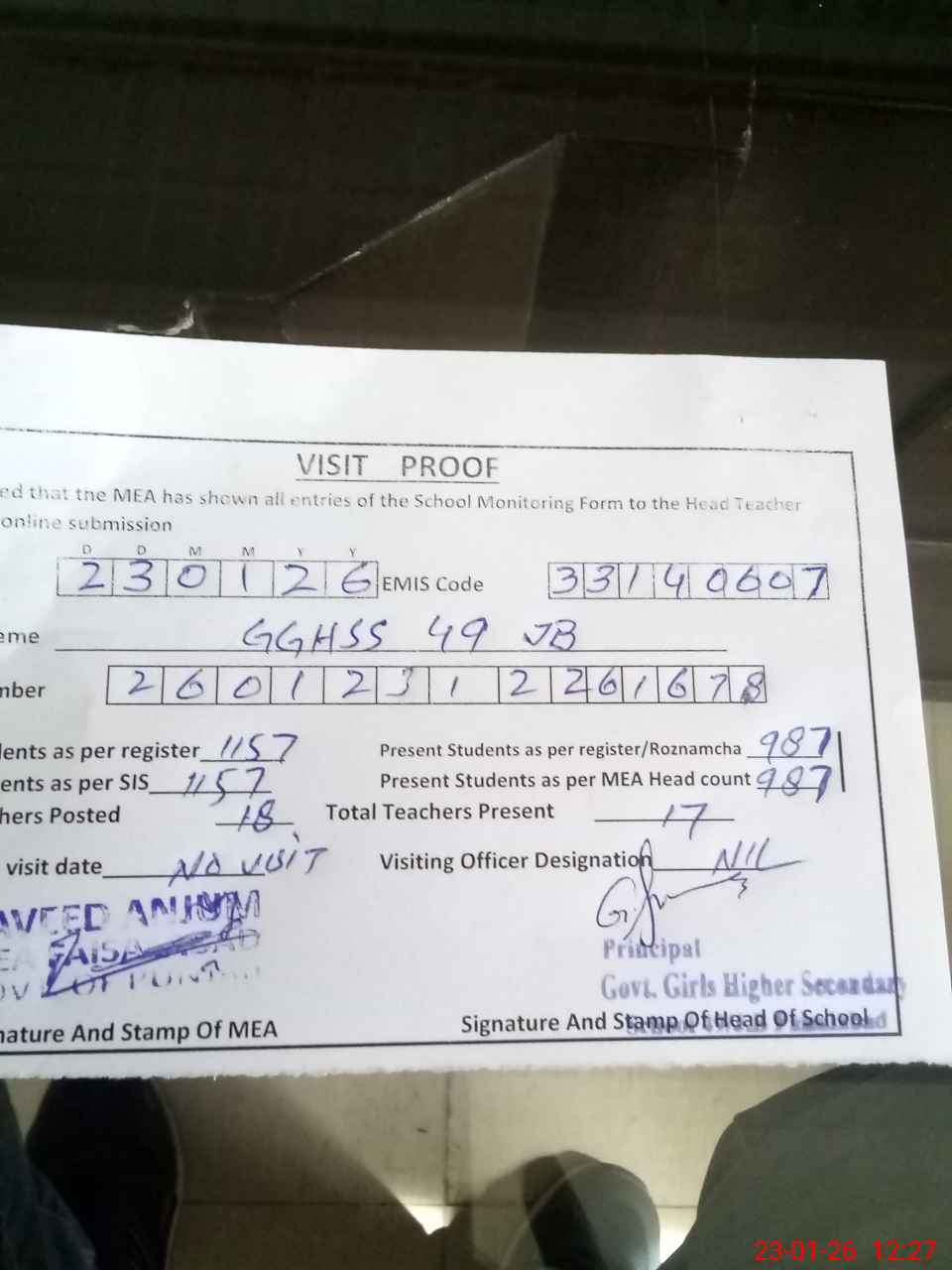 | Attendance Register | Head Teacher | MEA with School | Visit Proof |
