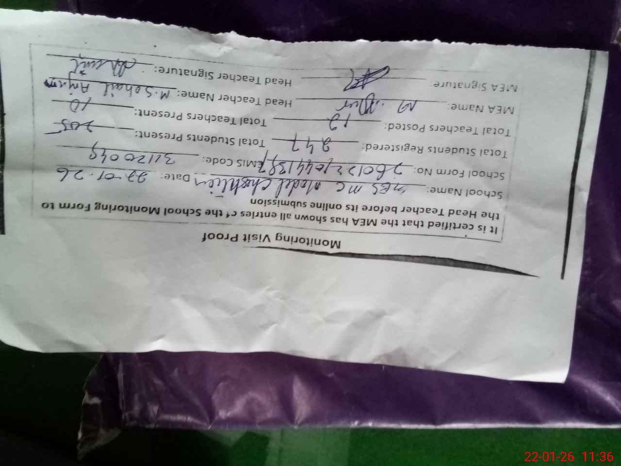 | Attendance Register | Head Teacher | MEA with School | Visit Proof |