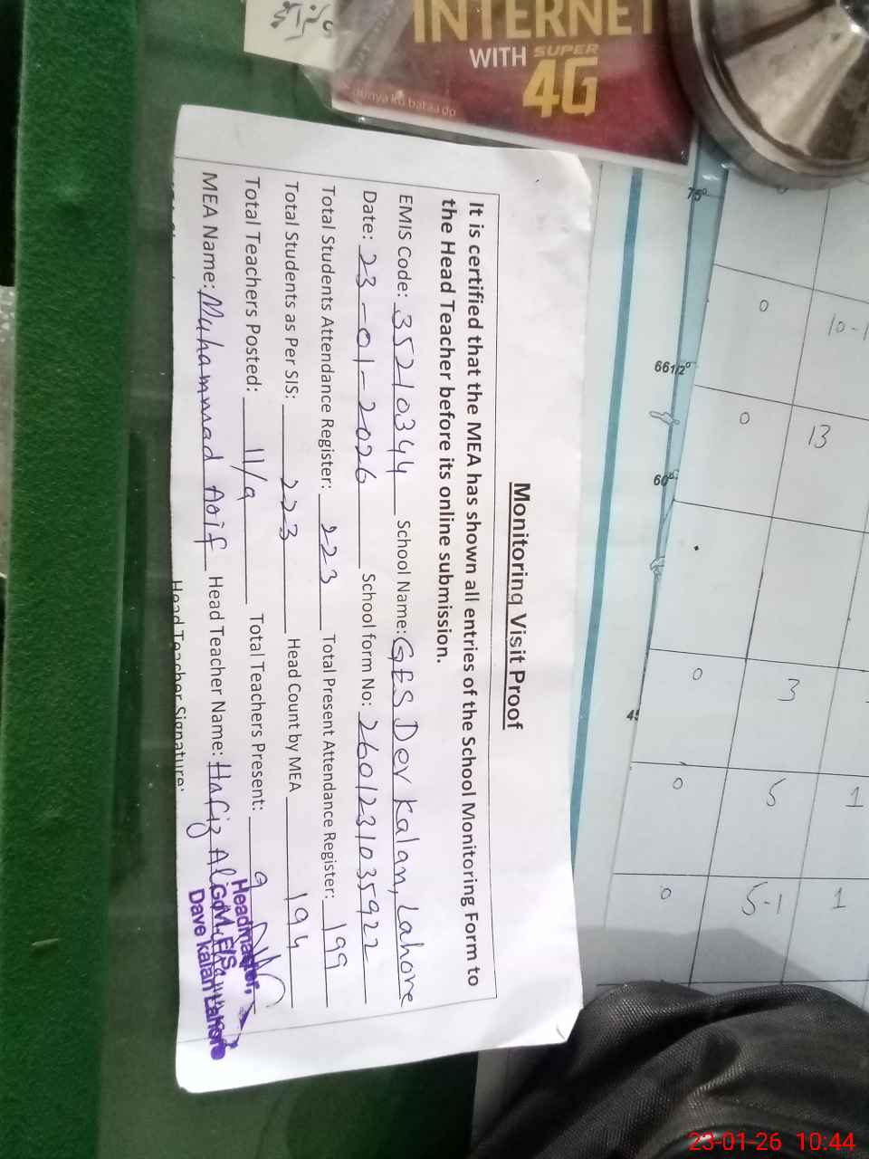 | Attendance Register | Head Teacher | MEA with School | Visit Proof |