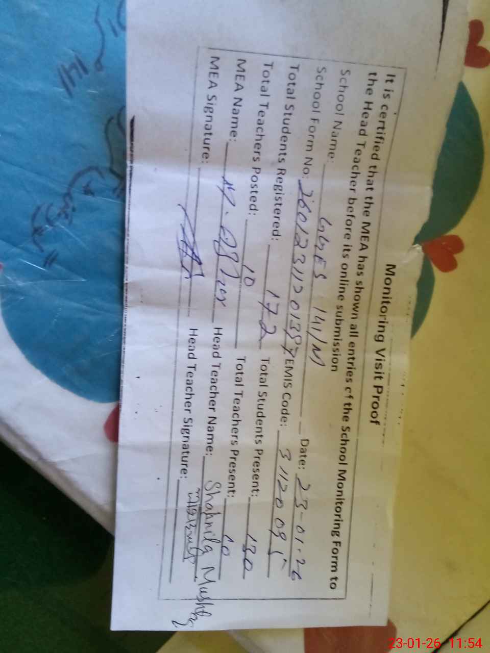 | Attendance Register | Head Teacher | MEA with School | Visit Proof |