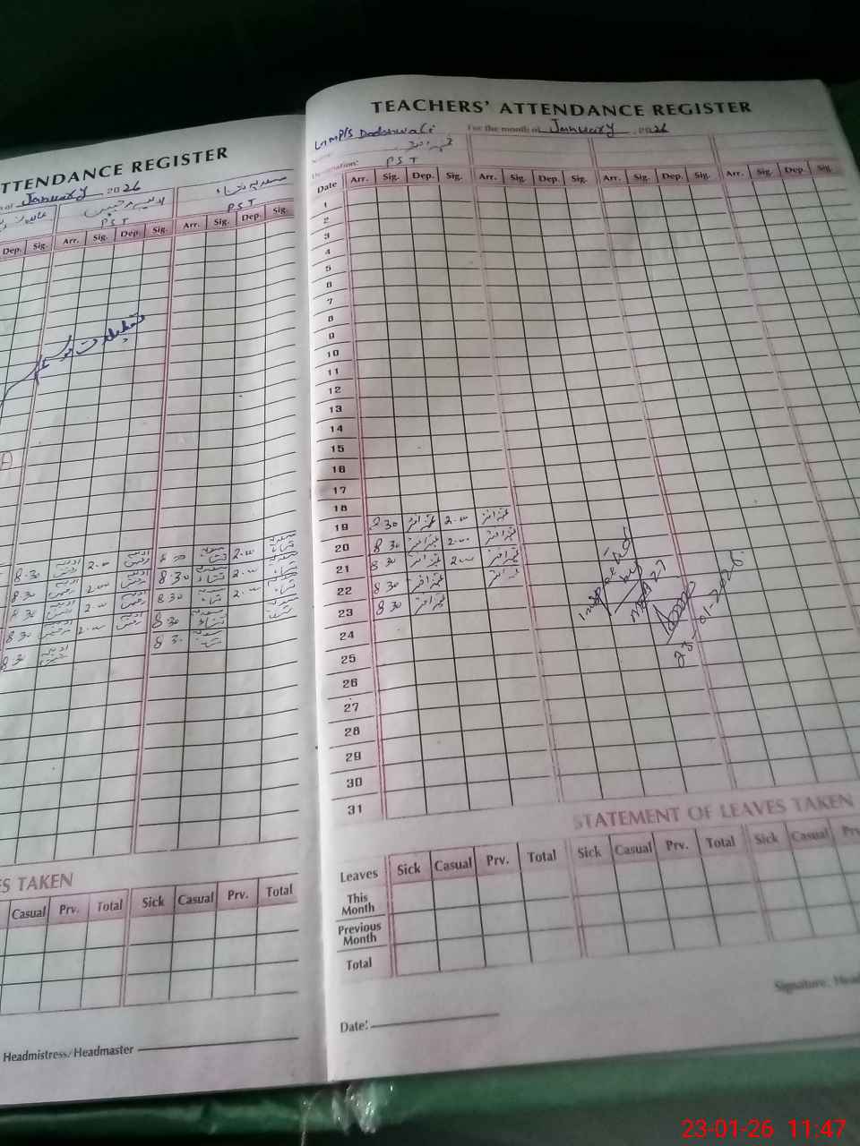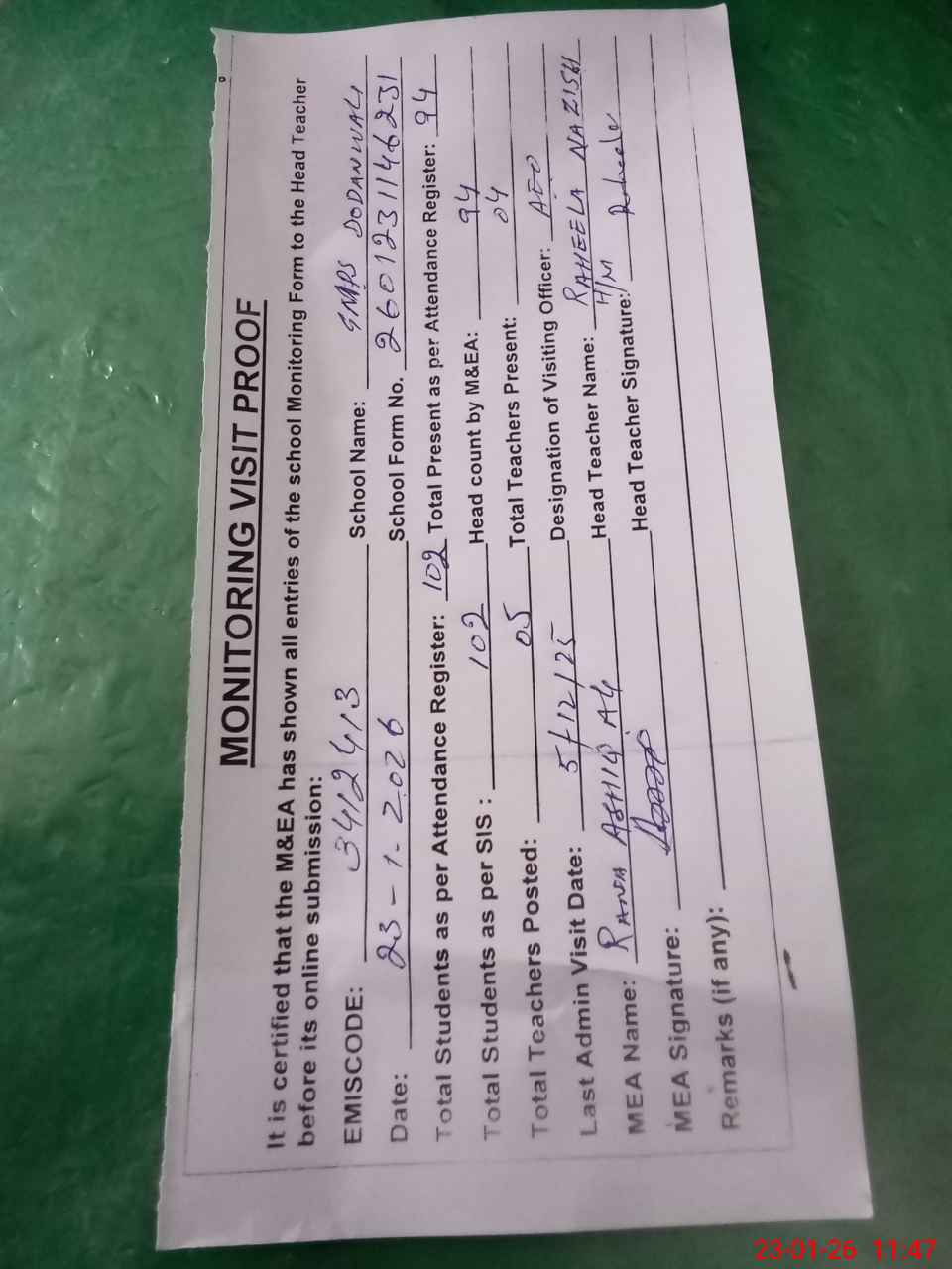 | Attendance Register | Head Teacher | MEA with School | Visit Proof |