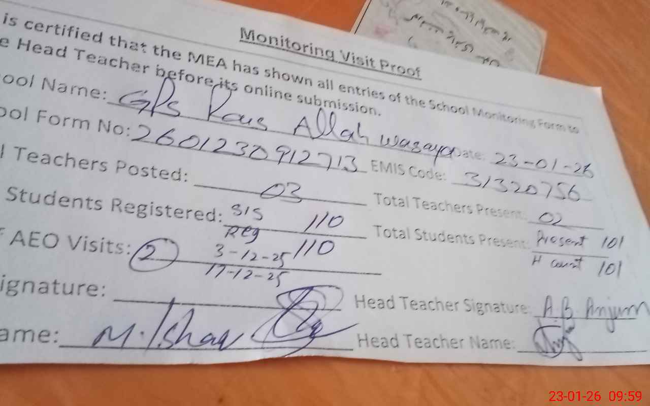| Attendance Register | Head Teacher | MEA with School | Visit Proof |