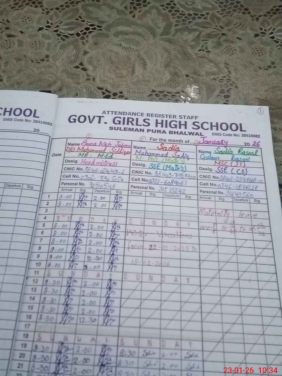 | CNIC | Full Name | Designation | R/C | Absence During Last Calender Month |