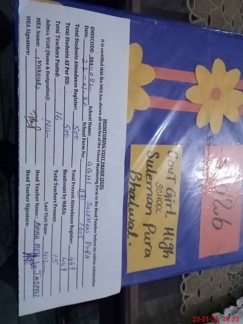 | Attendance Register | Head Teacher | MEA with School | Visit Proof |