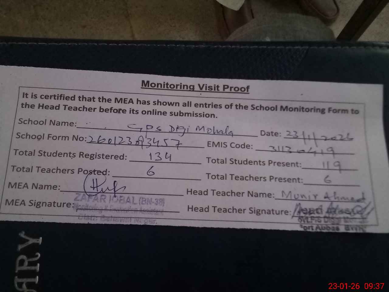 | Attendance Register | Head Teacher | MEA with School | Visit Proof |