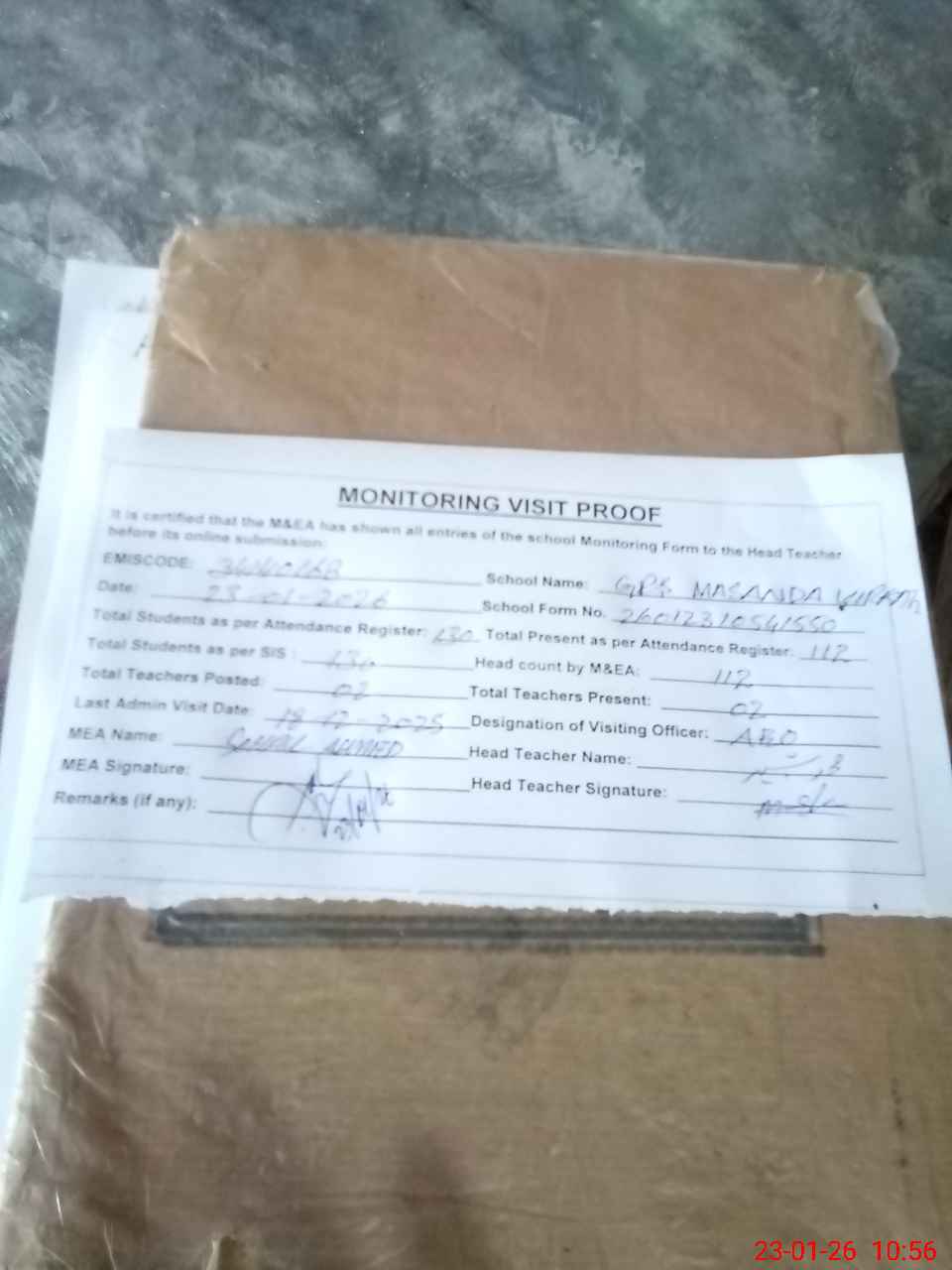 | Attendance Register | Head Teacher | MEA with School | Visit Proof |