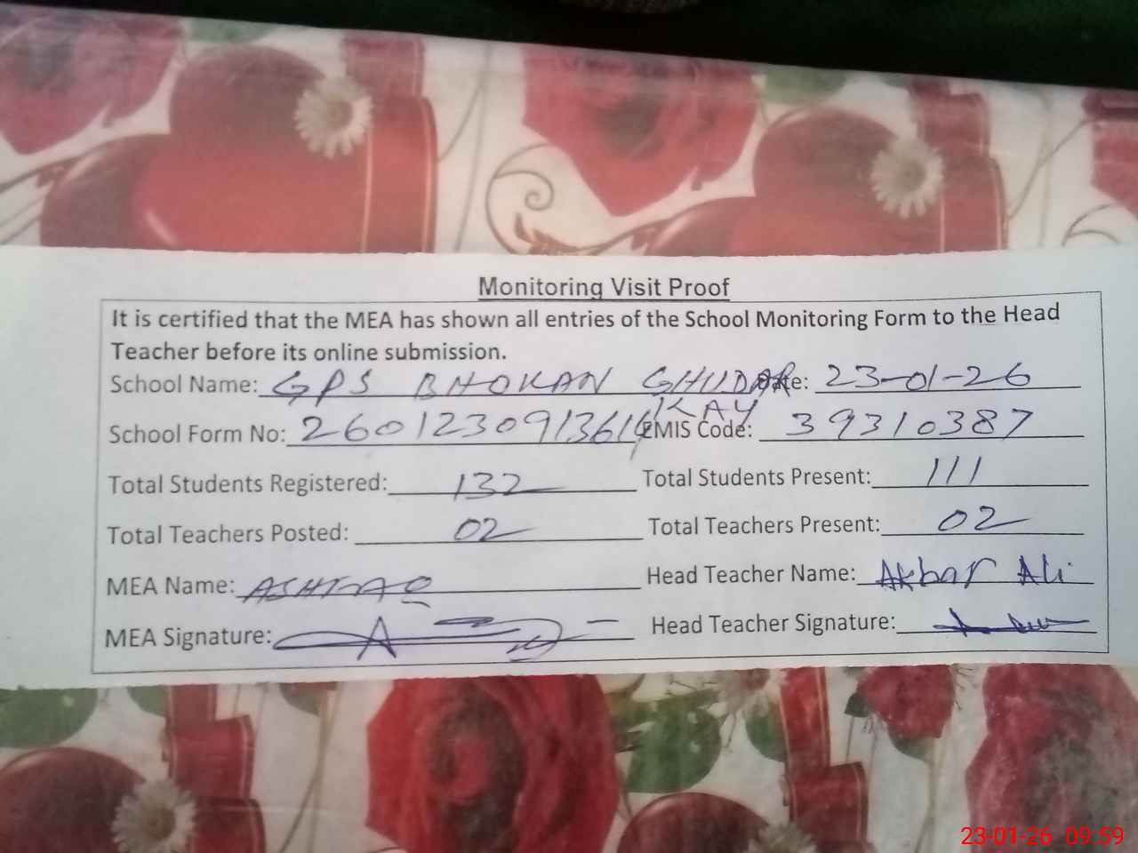 | Attendance Register | Head Teacher | MEA with School | Visit Proof |