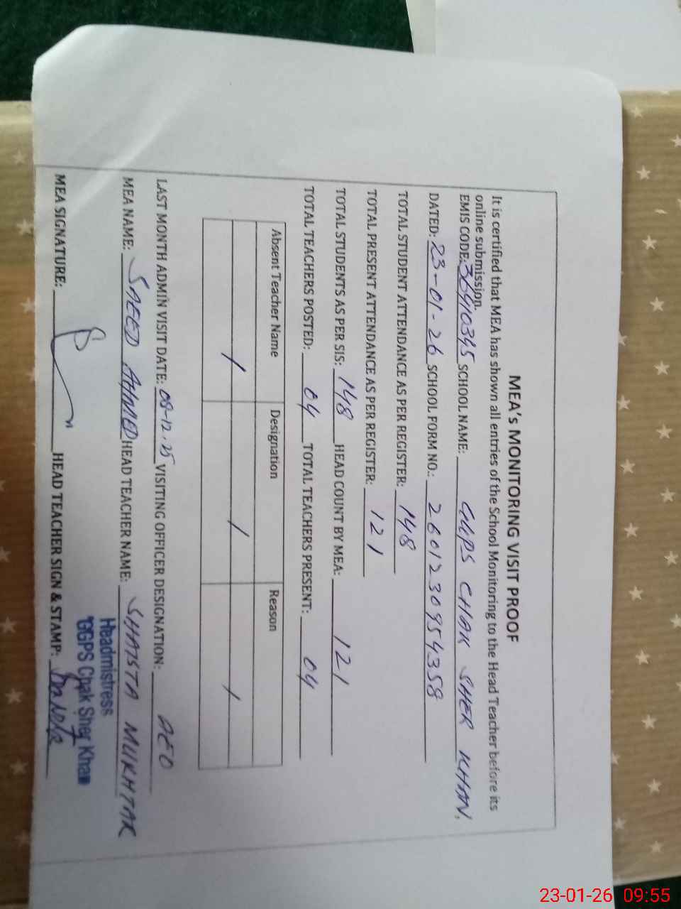 | Attendance Register | Head Teacher | MEA with School | Visit Proof |