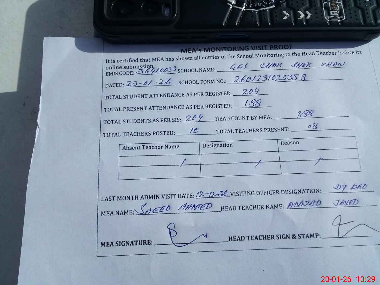 | Attendance Register | Head Teacher | MEA with School | Visit Proof |